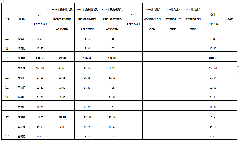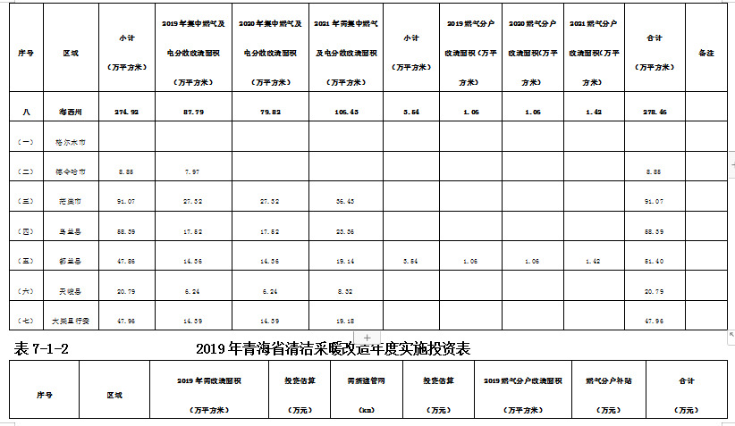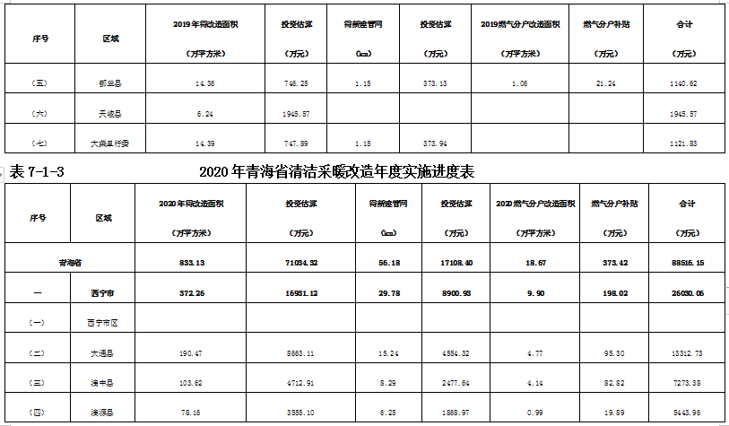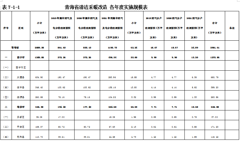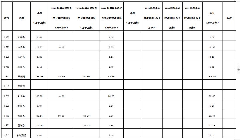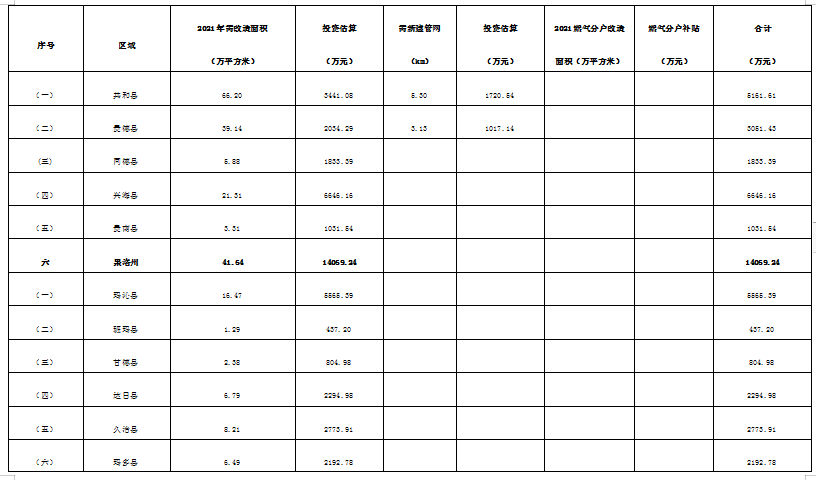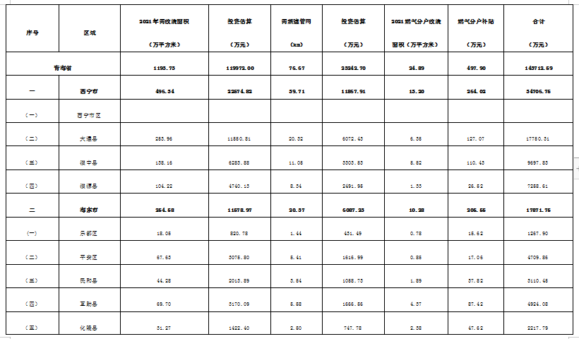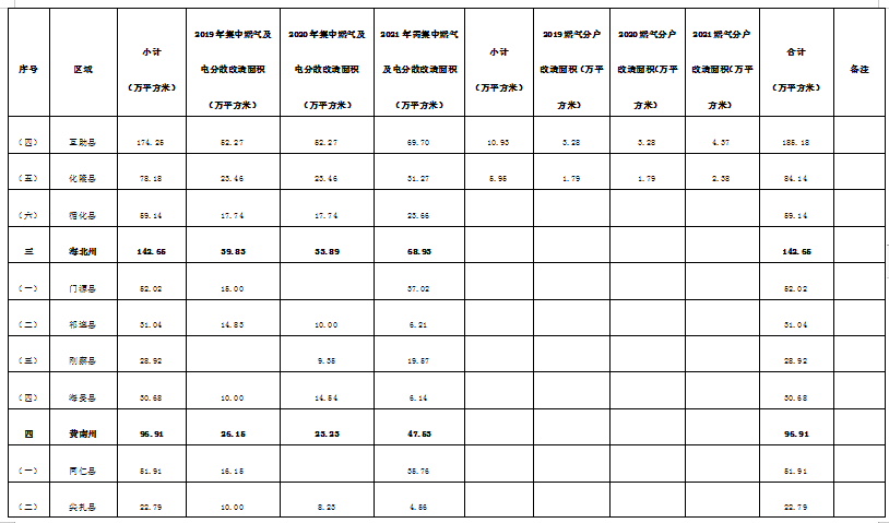 依据国家能源局《关于印发北方地区冬季清洁取暖规划(2017-2021年)的通知》(发改能源[2017]2100号)文件要求,结合我省实际,综合考虑大气污染防治紧迫性,经济承受能力,工作推进难度等因素,优先推进经济条件、基础设施条件较好和人口较为集中的地区,逐步推进各地区试点改造任务。2019~2021年,全省共改造清洁采暖面积2952万平方米,其中2019年完成880.30万平方米,投资为9.26亿元;2020年完成851.80万平方米,投资为8.85亿元;2021年完成1218.62万平方米,投资为14.37亿元。详见下表。