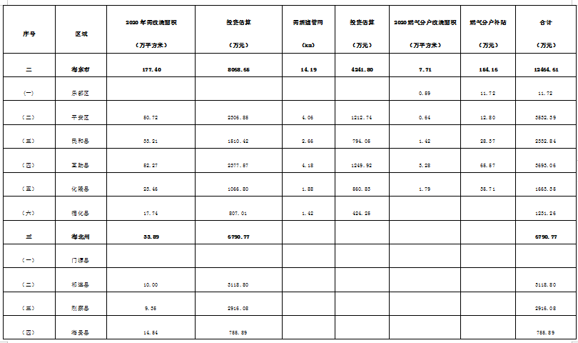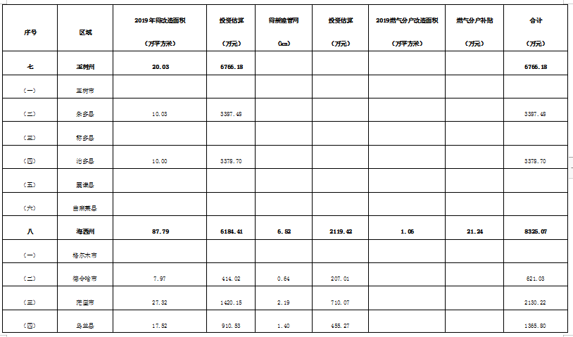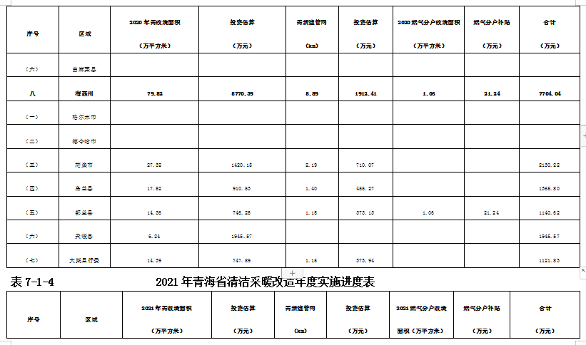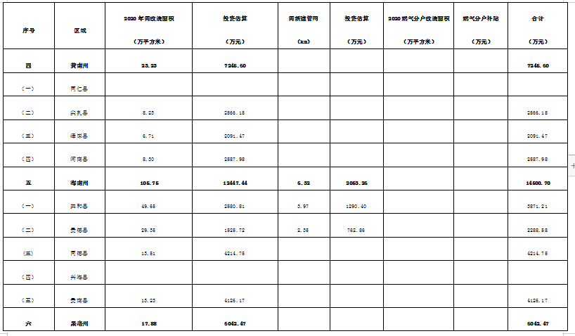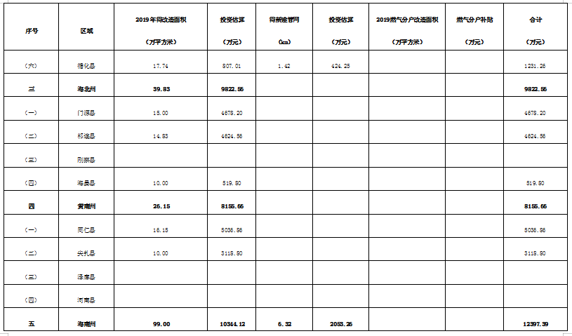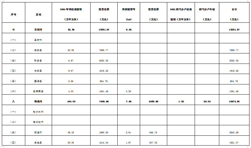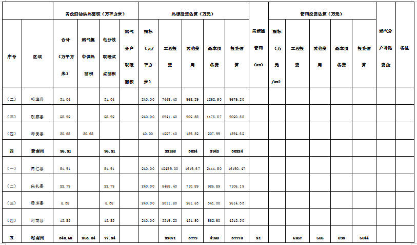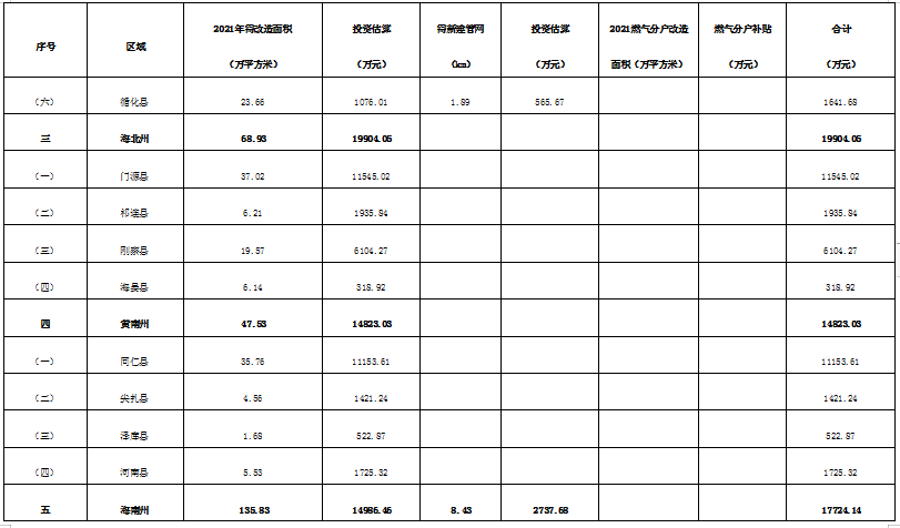 依据国家能源局《关于印发北方地区冬季清洁取暖规划(2017-2021年)的通知》(发改能源[2017]2100号)文件要求,结合我省实际,综合考虑大气污染防治紧迫性,经济承受能力,工作推进难度等因素,优先推进经济条件、基础设施条件较好和人口较为集中的地区,逐步推进各地区试点改造任务。2019~2021年,全省共改造清洁采暖面积2952万平方米,其中2019年完成880.30万平方米,投资为9.26亿元;2020年完成851.80万平方米,投资为8.85亿元;2021年完成1218.62万平方米,投资为14.37亿元。详见下表。