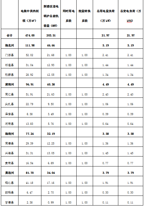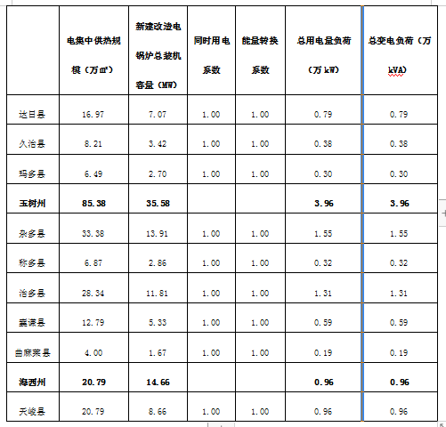 按每兆瓦锅炉容量可供采暖面积12000平方米计,估算所需取暖规模的装机容量为203.51兆瓦,各种清洁能源采暖方式中能量转换系数为0.9~1.7,测算用电负荷时按最低的0.9进行测算,用电系数取0.7,得出总用电负荷约21.97万千瓦,再以用电负荷的基础上考虑同时运行系数及功率因数,测算出电分散试点实施完成后,将增加年变电负荷约21.97万千伏安。具体分地区能源需求详见下表: