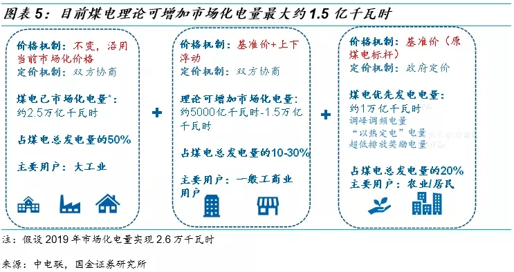 煤电最大市场化占比理论值为80%。改革举措第三条指出“燃煤发电电量中居民、农业用户用电对应的电量仍按基准价执行”的电量部分,这部分电量主要为优先发电,包括“为满足调峰调频和电网安全需要,调峰调频电量优先发电;为保障供热需要,非统调燃煤热电联产机组实行‘以热定电’电量优先发电;超低排放的燃煤机组奖励电量优先发电”。预计上述优先供电量在20%左右,则符合市场化条件的煤电发电量比重约为80%,即理论煤电最大市场化比重为80%。