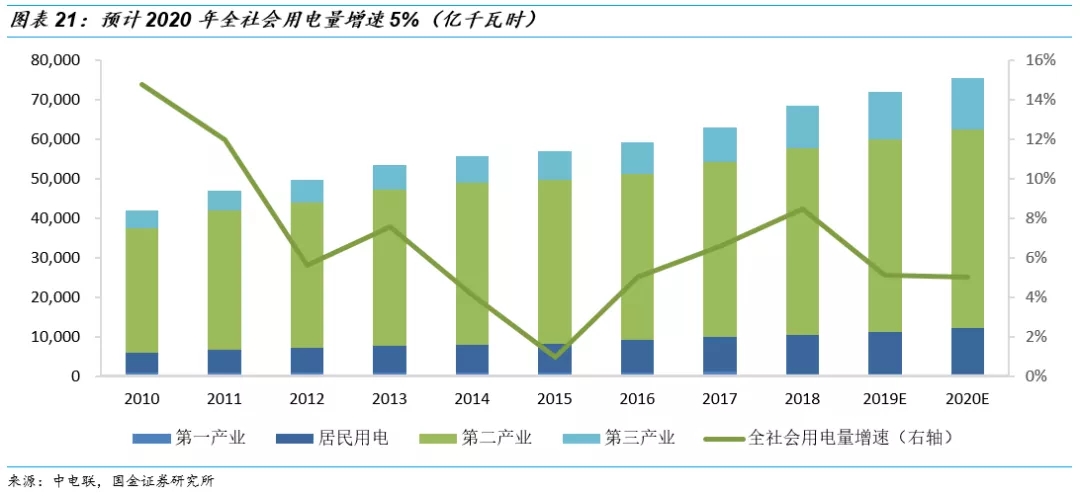 预计2020年全社会用电量75537亿千瓦时,同比增速5%。一、二、三产与居民用电量分别为834、50355、13009、11339亿千瓦时,增速分别为8.0%、3.3%、9.0%、8.1%。增长的主要动力来自于:1. 居民用电近年来持续稳健增长;2. 5G通信会成为2020年三产用电增长的强劲动力;3. 2019年凉夏与暖冬带来的空调负荷下降以及中美贸易战等用电不利因素影响减弱。