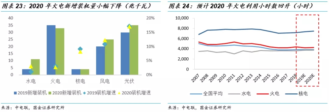 利用小时数假设:我们预计2020年全社会用电量增速5%,全国发电装机容量增速5.4%。新增火电装机33兆千瓦,火电利用小时数增加66小时。