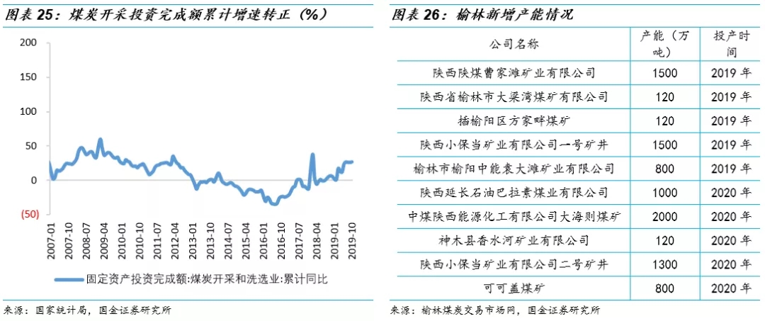 导致煤价出现四年一个变化周期的原因是,一般煤炭开采的固定资产投资始于煤价上涨周期的第二年,新矿从开始建设到完全投产需要2-3年时间。煤矿大规模资本开支回暖始于2017年年中,我们预计2019-2020年,包括鄂尔多斯、神木、榆林等地区将有2亿吨新增煤炭产能释放,目前官方信息为榆林地区增加9260万吨产能。进入2019年,我国煤炭固定资产投资完成额累计增速转正并逐步走高,截止2019年10月,累计增速已达26.9%。预计至2020年,我国煤炭产能将大幅提高,供需格局继续转变,带来价格持续下降。