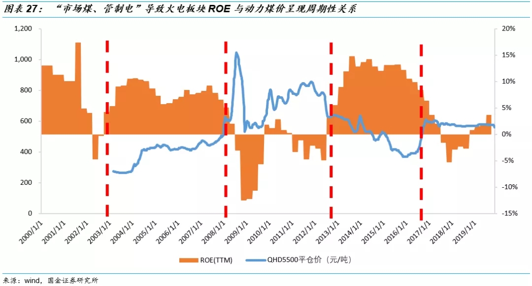 在以前电价固定、煤价浮动的时期,火电板块ROE与煤价呈现高度负相关的周期性关系。2003-2008年、2008-2012年、2012-2016年各为一个周期,每个周期大致为四年。其中2003-2008年、2012-2016年两个周期,煤价中枢处于400-500元/吨位置,而且不乏跌破400元/吨大关时期,此时火电企业ROE保持在8%以上水平,最高接近15%,盈利可观。2008-2012年周期,动力煤价格大幅提高,火电企业ROE为负值,行业艰难度日。