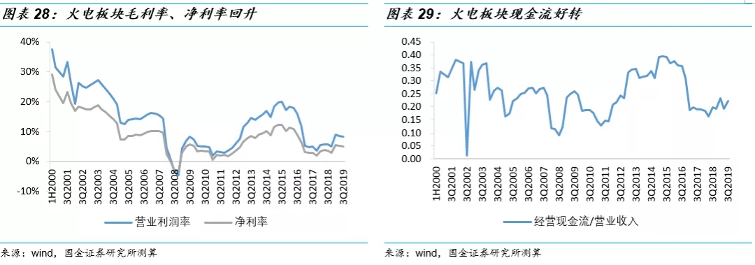 电力市场化改革为煤电带来顺价机制,改变了过往由于政府定价煤电的逆周期性特征。然而,电力市场化后,80-90%的中长期合约将稳定电价变动周期在一年左右,因此,火电板块ROE和动力煤价的此消彼长在中长期内仍将继续存在,但波动性更小。站在现在的时点上,煤价从2019年一季度下跌,目前已经跌至550元/吨位置,火电企业经营好转,ROE转正后继续走高,毛利率、净利率提高,企业经营性现金流回暖,2016-2019年的火电低谷周期接近结束,下一轮火电板块的景气周期即将来临。