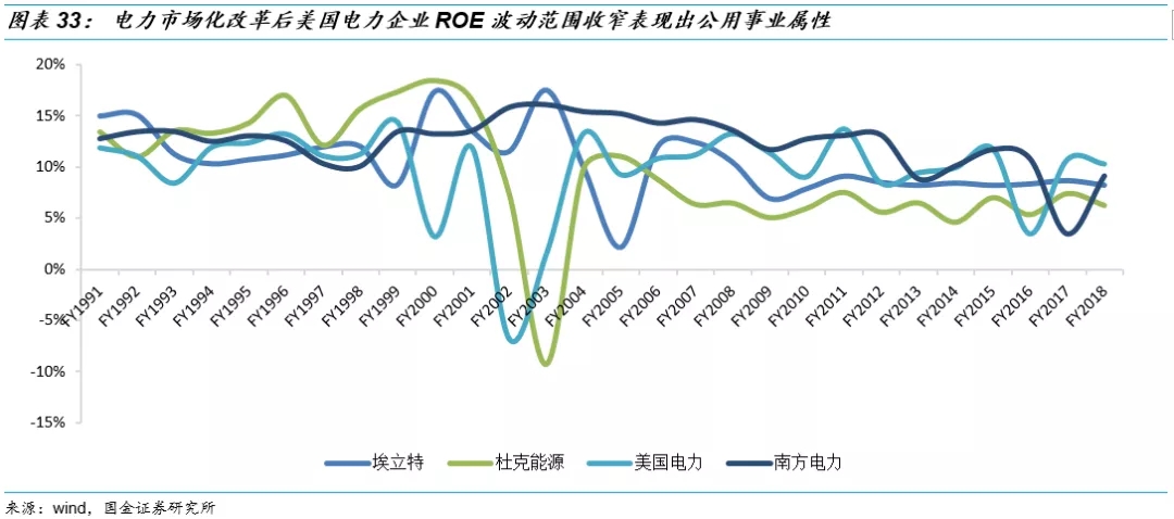 我们选取了美国电力、南方电力、杜克能源和埃立特四家企业作为借鉴,分析其ROE在电力改革前后变化,尝试预测我国火电板块盈利未来长期可能的演变方向。