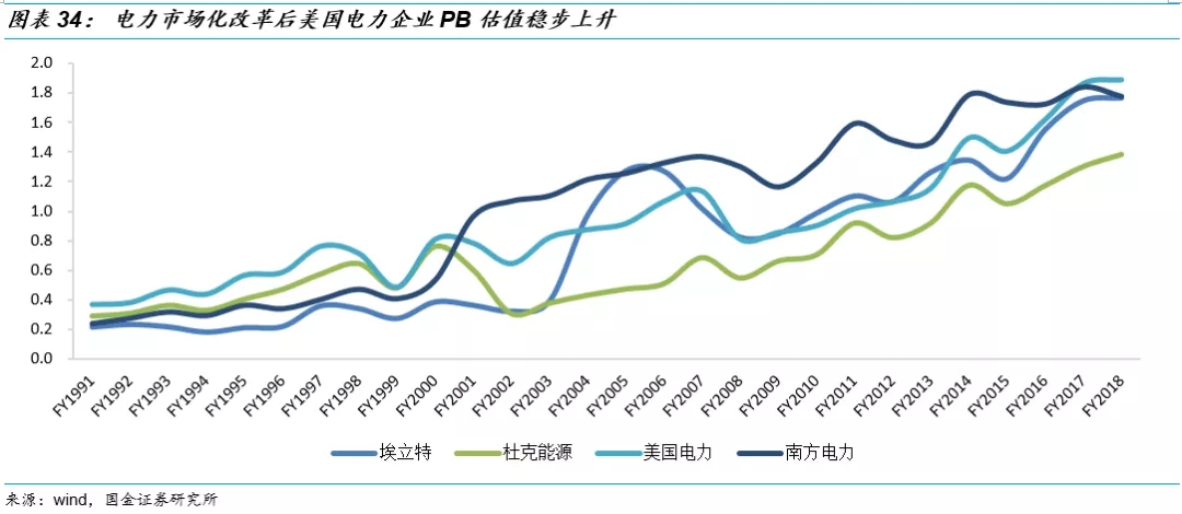 1992年美国由《能源政策法案》开放输电网接入,促进电力批发市场竞争,从而开启了电力市场化的改革历程。直到1999年,此时处于市场化前期,电力企业ROE波动尚不明显。1999年末,市场化改革力度加强,电力企业ROE和PB估值大幅波动,行业进入动荡期。在此期间,美国的电价受市场化政策驱动,出现显著上涨。之后到2008年,电力市场化演进基本完成,美国主要电力公司ROE波动减弱,波动幅度收窄至5%-15%之间,表现出显著公用事业属性,PB估值稳步上升。