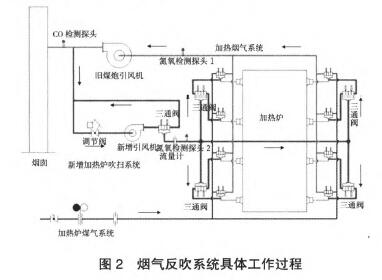 当煤气蓄热结束后(蓄热三通阀煤气阀关闭),反吹烟气经由调节阀、新增引风机、反吹烟气流转控制三通阀进入吹扫总管道,被引入总管道的烟气通过吹扫阀(吹扫阀采用三通阀,一加和二加共用一个三通阀,均热上下两段共有一个三通阀)将蓄热三通阀和烧嘴之间公共管道内的煤气吹扫到炉内进行燃烧。吹扫结束后,通过调整反吹烟气流转三通阀的阀门阻止反吹烟气进入吹扫管道,同时蓄热三通阀烟气阀打开排烟。通过以上换向过程由反吹烟气将蓄热三通阀和烧嘴之间公共管道内残余的煤气进行了吹扫置换,使所有煤气进入炉膛内燃烧,杜绝了煤气外排。为保证吹扫效果,在煤烟总管上设一个CO检测探头,检测实际煤烟排放值,并调节各段的吹扫时间。烟气反吹系统工作过程如图2所示。
