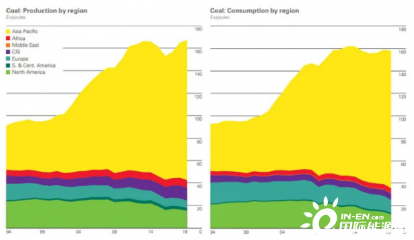 2020年全球煤炭生产和消费占比图 图片来源:BP