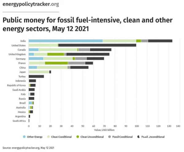 不仅仅是印尼,据了解目前大部分国家公布的就响应“新冠”疫情承诺的公共财政投入仍以“棕色”为主。Energy Policy Tracker的统计发现:后疫情时代促使公共资金对化石能源的投入变得更多。截至2021年4月,20国集团(G20)国家已承诺提供6410亿美元用于能源部门的复苏资金,而其中化石燃料占比为45%,可再生能源为38%。值得注意的是,截止今年5月,疫情后印尼政府在能源方面的公共资金基本全部流向煤炭。
