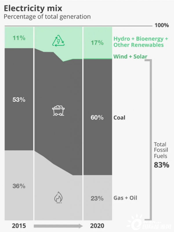 在逐步淘汰煤炭(煤炭在总发电量中的占比)的全球进展中,世界平均煤电占比从2015年的38%下降到2020年的34%。印度尼西亚的煤电占比从2015年的53%上升到2020年的60%。[11]