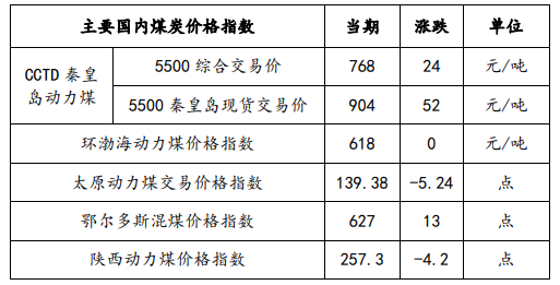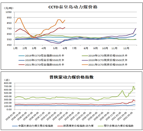 近期主产地安检、环保力度不减,煤矿普遍按核定产能生产,现货市场供应增量不明显。宏观调控政策持续加码,下游用户对高价市场煤接受意愿减弱,部分产地煤矿价格有所下调。但随着夏季耗煤高峰期临近,终端耗煤企业采购需求有所增强,主产地局地矿井煤价小幅调涨。而在需求支撑下,港口市场价格再度上行,5500大卡报价重回900元/吨以上。而因价格异动,多个煤炭日指数及CECI系列指数再度停发。