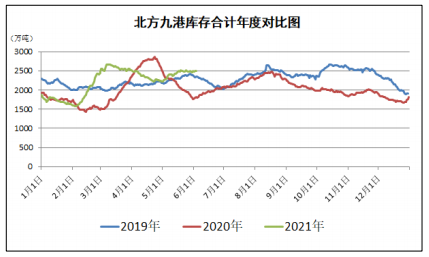 近期,国务院安委办派出多个暗查暗访组对矿山、危化品、消防、工贸等重点行业领域开展安全生产暗查暗访,曝光问题隐患,推动有关地区及部门、企业切实落实安全生产责任、防范化解重大安全风险。主产地安检持续,短期内依靠现有产能增产可能性不大,产量增加还需依靠优质产能释放。陕西榆林已提出对有合理产能核增需求的煤炭企业,尽快完善相关手续,及时上报,市相关部门将会加快优质产能的核增和新建煤矿报批的进度,合法合规释放优质煤炭产能,进一步增大市场供应。主产地煤炭增量释放仍需时日。港口方面,贸易商发货积极性较高,但下游终端询货市场煤意愿不高,仍以大矿长协调运为主,市场价格涨跌两难,高位维稳。北方港库存高位小幅波动,6月4日北方九港库存合计2498.4万吨。