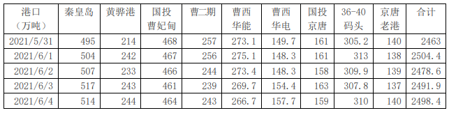 北方港库存在2500万吨左右波动,6月4日北方九港库存合计2498.4万吨;秦皇岛港库存492万吨,周环比有所回升;港口锚地船舶及预到船舶数量合计168艘,其中预到船舶49艘。