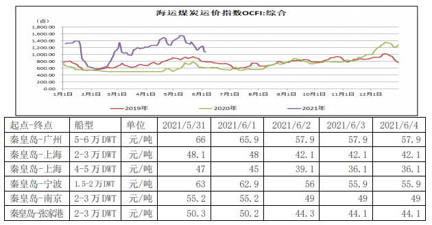 迎峰度夏背景下,港口煤炭市场价格接连上涨,但终端接受度不高,整体以观望为主。上周前期,市场货盘偏少,运价缺乏支撑,延续近日的下行通道。周后期,终端采购积极性有所增加,船东报价坚挺,运价止跌企稳。6月4日沿海煤炭运价OCFI报收于1075.29点,周环比下降113.74点,日环比微降0.37点。