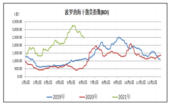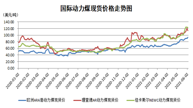 据印尼能源与矿产资源部信息,2021年6月份印尼动力煤参考价为100.33美元/吨,环比提高10.59美元/吨,上升11.8%;同比增加47.35美元/吨,增长89.37%。上周欧洲三港煤炭价格分化,欧洲ARA延续上涨走势,理查德RB、纽卡斯尔NEWC价格回落。波罗的海干散货指数继续下行,6月4日报收2438点,周环比下跌158点。