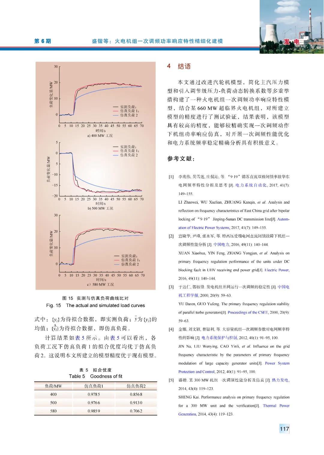 结论:本文通过改进汽轮机模型,简化主汽压力模型和引入调节级压力-负荷动态转换系数等多重举措构建了一种火电机组一次调频功率响应特性模型,结合某660 MW超临界火电机组,对所建立模型的精度进行了测试验证,结果表明,该模型具有较高的精度,能够较精确实现一次调频动作下机组功率响应仿真,对开展一次调频性能优化和电力系统频率稳定精确分析具有积极意义。