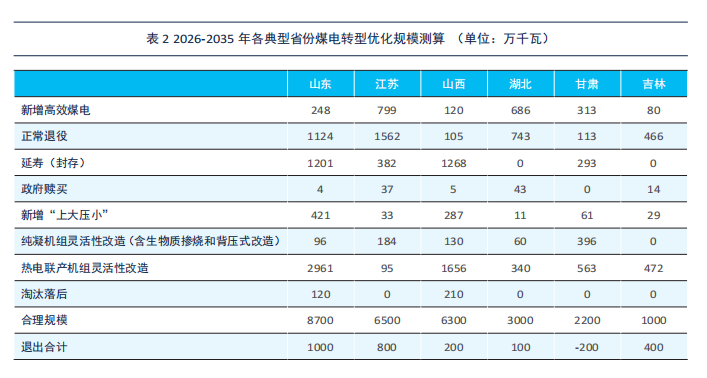 2025年至2035年阶段,山东、江苏、吉林、湖北、山西煤电会有压减的潜力;而甘肃省因为可再生能源规模进一步扩大及跨区送出需求,预计会新增约200万千瓦的配套煤电。