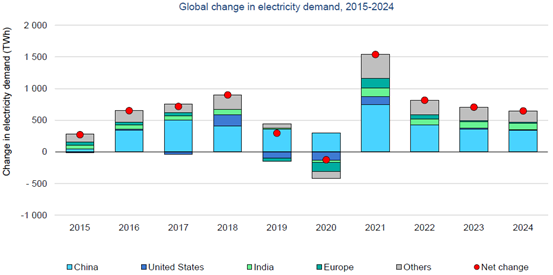 在欧洲和美国,2021年的电力需求恢复至与新冠肺炎疫情前类似的水平——这两个地区均存在更多的天气驱动需求。未来几年,由于能源效率措施会抵消电气化的增加,预计平均增长将放缓。