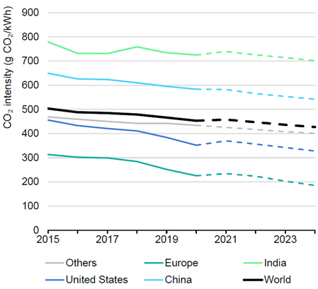 2021年,全球发电的碳排放强度增长了1%,这是自2011年以来的首次增长。预计在2022~2024年期间,碳排放强度将平均每年下降2%,因为低碳能源将满足这一阶段的大部分新增需求。尽管在2021~2024年期间,全球排放强度整体下降了78%,占全球消费量的95%,但不同地区的减排幅度仍存很大差异。