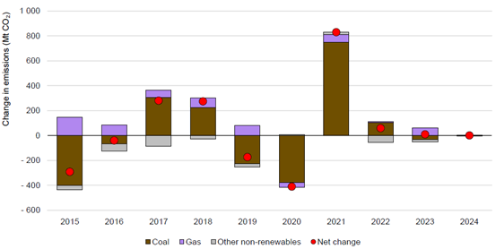需求增长放缓以及2021年后低碳发电的持续增长,叠加气电和煤电排放量增长缓慢,将使2022~2024年的年排放量增幅大大低于1%。到2024年,发电产生的二氧化碳排放量将超过13亿吨。