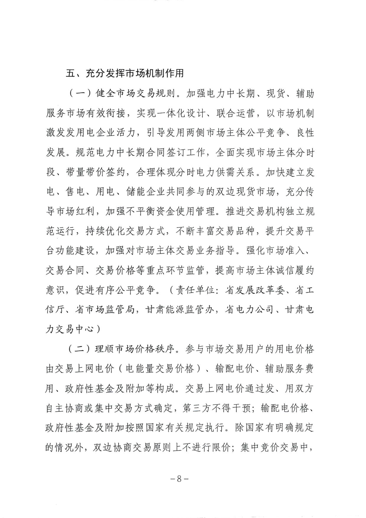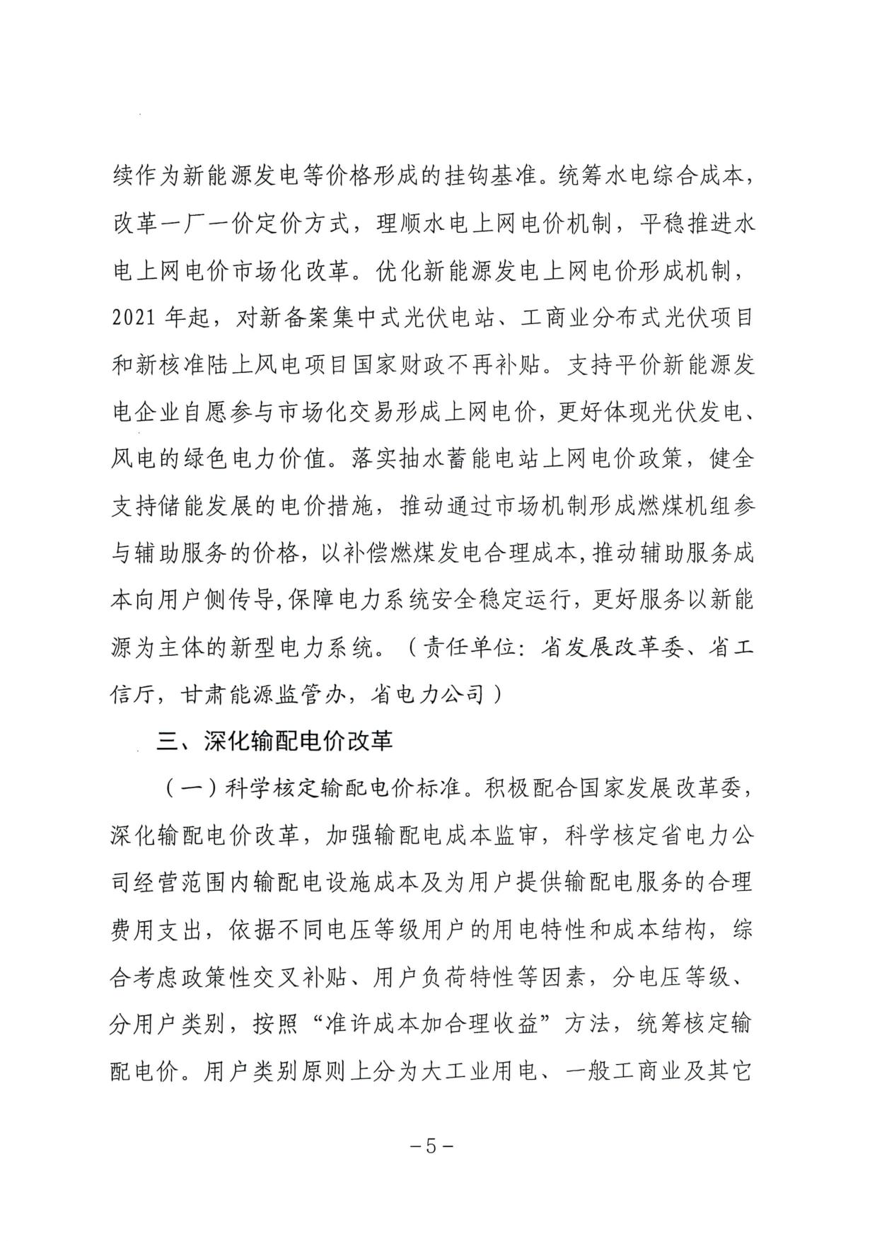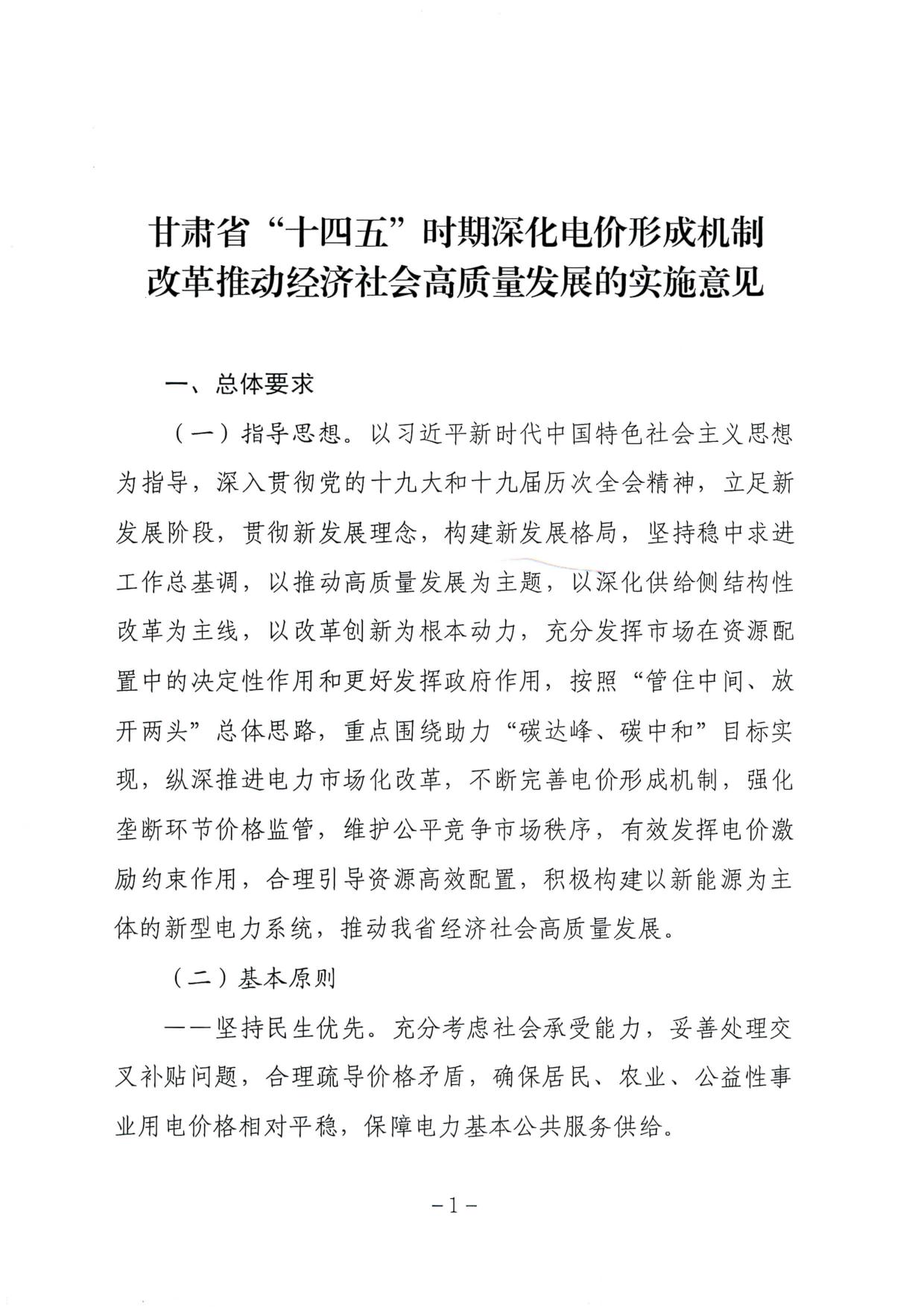 近日,甘肃省发改委发布《甘肃省“十四五”时期深化电价形成机制改革推动经济社会高质量发展的实施意见》,落实抽水蓄能电站上网电价政策,推动通过市场机制形成燃煤机组参与辅助服务的价格,以补偿燃煤发电合理成本,推动辅助服务成本向用户侧传导,保障电力系统安全稳定运行,更好服务以新能源为主体的新型电力系统。全文如下: