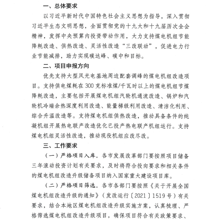 支持供电煤耗在300 克标准煤/千瓦时以上的煤电机组节煤降耗改造,推动具备条件的纯 凝机组开展热电联产改造优化已投产热电联产机组运行。支持煤电机组灵活性改造,推动现役机组应改尽改。详情如下: