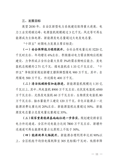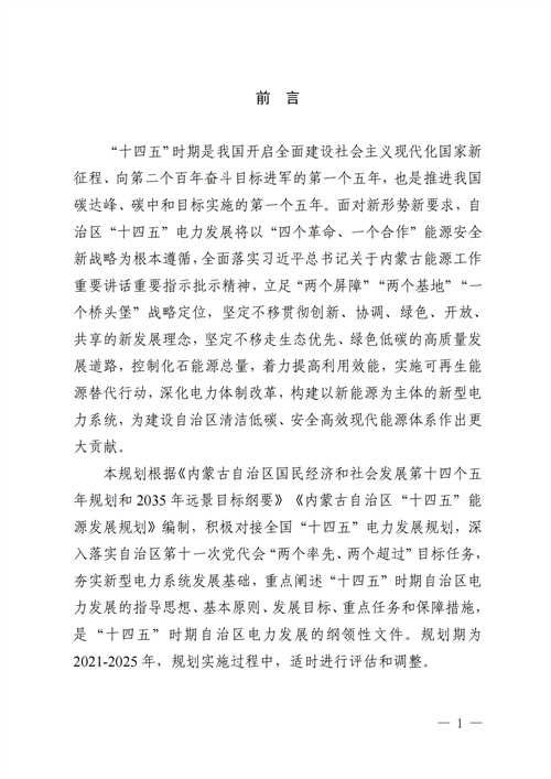 十四五期间,内蒙古自治区计划在新型电力系统建设取得重大进展,电力工业实现碳达峰,电源装机规模超过3亿千瓦,风光等可再生能源成为主体电源,新能源发电总量超过火电发电总量。