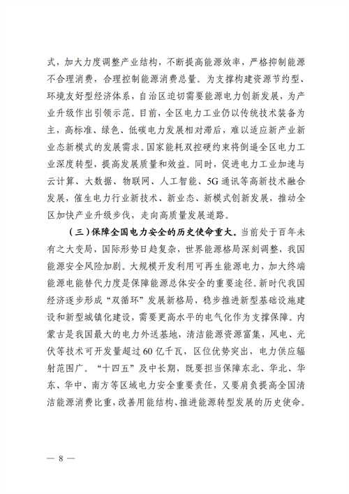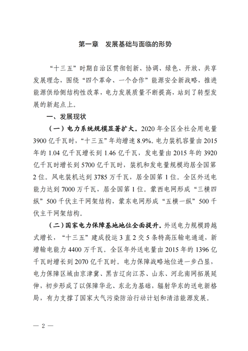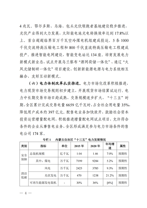 3月29日,内蒙古自治区能源局印发关于《内蒙古自治区“十四五”电力发展规划》的通知,文件指出,内蒙古是我国最大的电力外送基地,清洁能源资源富集,风电、光伏等技术可开发量超过60亿千瓦,区位优势突出,电力供应辐射范围广。“十四五”及中长期,既要担当保障东北、华北、华东、华中、南方等区域电力安全重要责任,又要肩负提高全国清洁能源消费比重,改善用能结构、推进能源转型发展的历史使命。