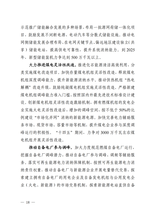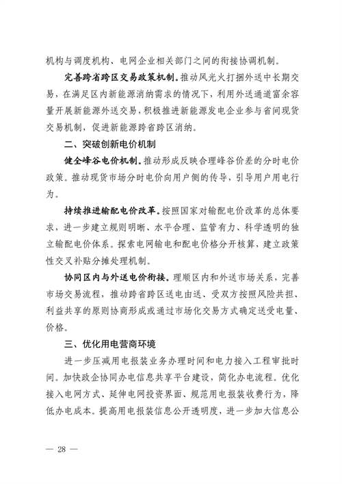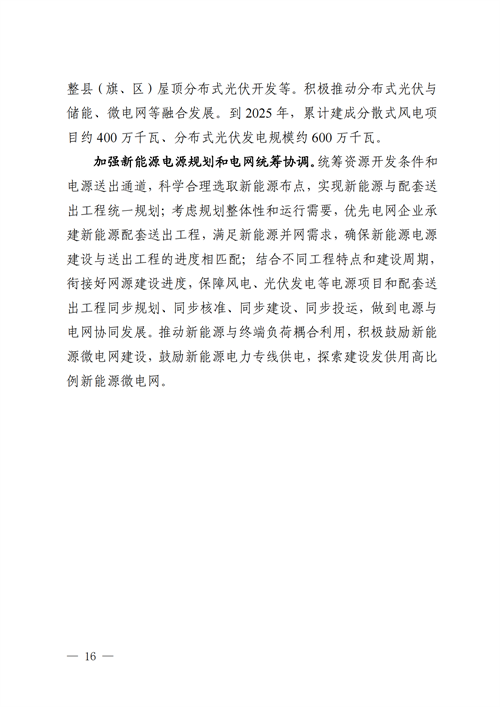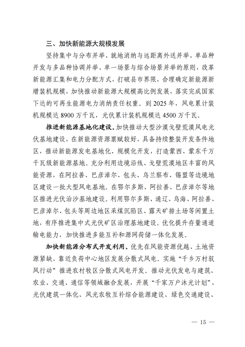 加快新能源大规模发展。坚持集中与分布并举、就地消纳与远距离外送并举、单品种开发与多品种协调并举、单一场景与综合场景并举的原则,改革新能源汇集和电力分配方式,打破县市界限,合理确定新能源新增装机规模,加快推动新能源大规模高比例发展,落实完成国家下达的可再生能源电力消纳责任权重。到2025年,风电累计装机规模达8900万千瓦,光伏累计装机规模达4500万千瓦。