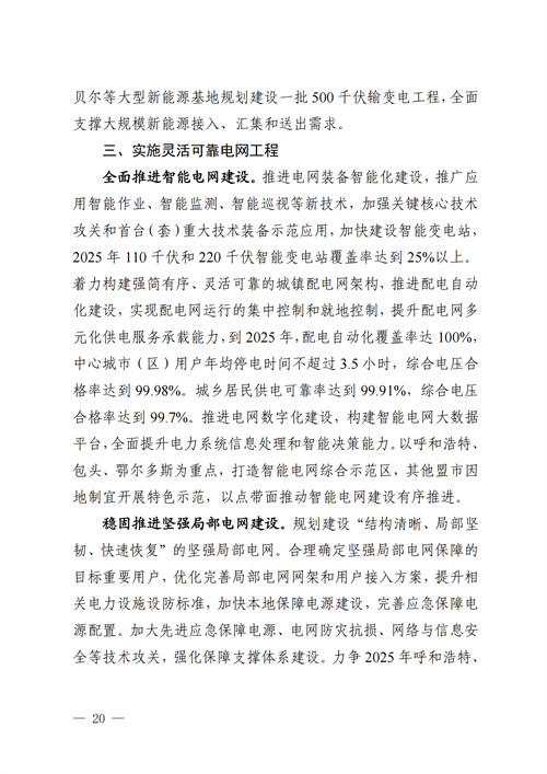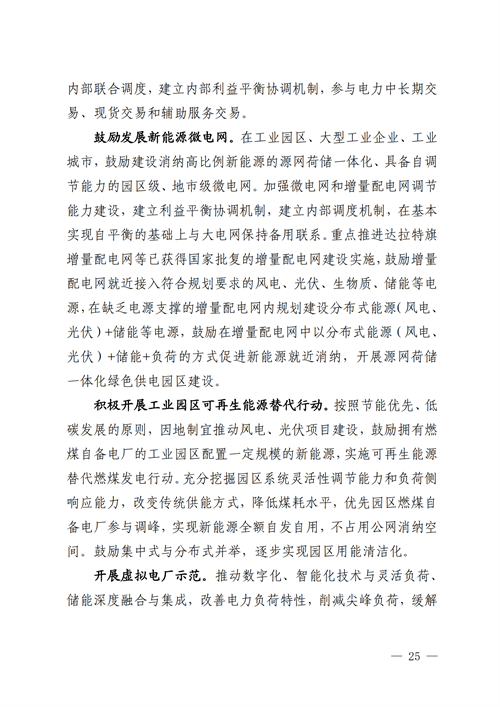 鼓励发展新能源微电网。在工业园区、大型工业企业、工业城市,鼓励建设消纳高比例新能源的源网荷储一体化、具备自调节能力的园区级、地市级微电网。加强微电网和增量配电网调节能力建设,建立利益平衡协调机制,建立内部调度机制,在基本实现自平衡的基础上与大电网保持备用联系。重点推进达拉特旗增量配电网等已获得国家批复的增量配电网建设实施,鼓励增量配电网就近接入符合规划要求的风电、光伏、生物质、储能等电源,在缺乏电源支撑的增量配电网内规划建设分布式能源(风电、光伏)+储能等电源,鼓励在增量配电网中以分布式能源(风电、光伏)+储能+负荷的方式促进新能源就近消纳,开展源网荷储一体化绿色供电园区建设。