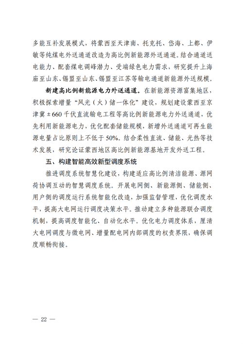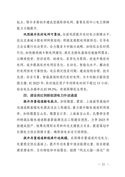 进一步夯实国家重要能源基地地位,规划建设跨省区电力外送通道,全区外送电能力达到7800万千瓦左右。新增外送通道可再生能源电量占比原则上不低于50%。