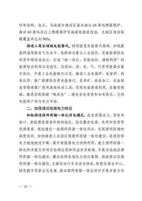 积极开展工业园区可再生能源替代行动。按照节能优先、低碳发展的原则,因地制宜推动风电、光伏项目建设,鼓励拥有燃煤自备电厂的工业园区配置一定规模的新能源,实施可再生能源替代燃煤发电行动。充分挖掘园区系统灵活性调节能力和负荷侧响应能力,改变传统供能方式,降低煤耗水平,优先园区燃煤自备电厂参与调峰,实现新能源全额自发自用,不占用公网消纳空间。鼓励集中式与分布式并举,逐步实现园区用能清洁化。