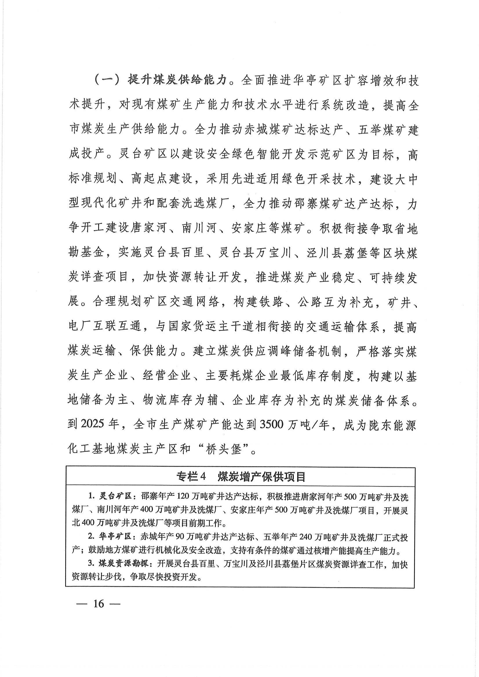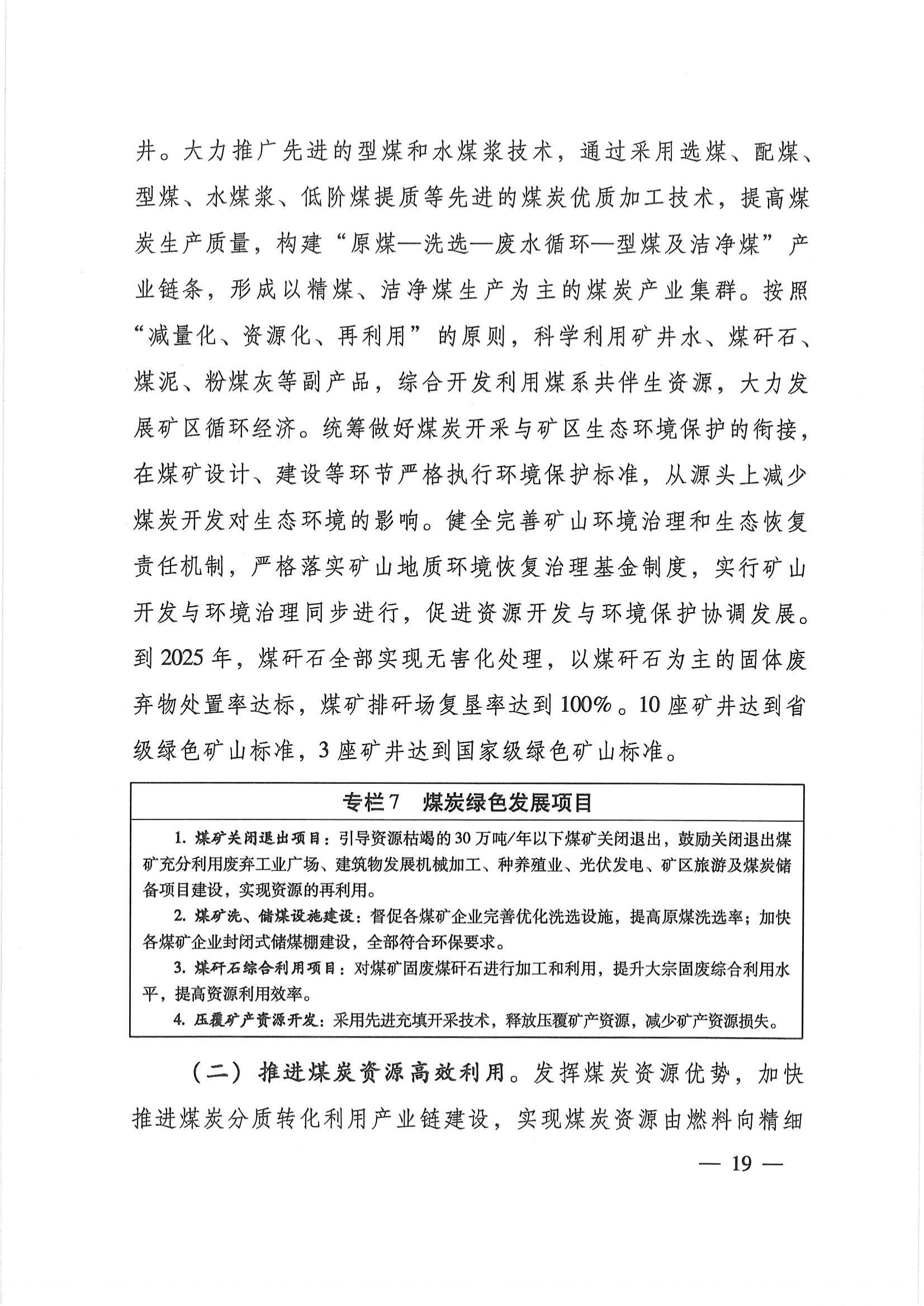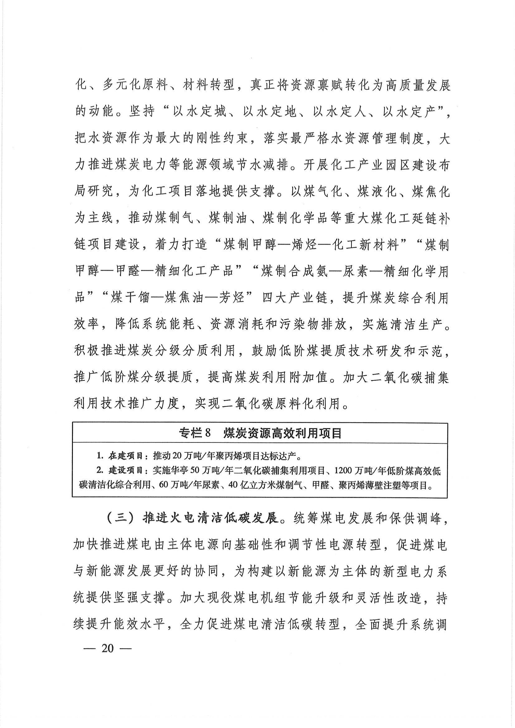 推进煤炭资源高效利用。发挥煤炭资源优势,加快推进煤炭分质转化利用产业链建设,实现煤炭资源由燃料向精细化、多元化原料、材料转型,真正将资源禀赋转化为高质量发展的动能。坚持“以水定城、以水定地、以水定人、以水定产”,把水资源作为最大的刚性约束,落实最严格水资源管理制度,大力推进煤炭电力等能源领域节水减排。开展化工产业园区建设布局研究,为化工项目落地提供支撑。以煤气化、煤液化、煤焦化为主线,推动煤制气、煤制油、煤制化学品等重大煤化工延链补链项目建设,着力打造“煤制甲醇—烯烃—化工新材料”“煤制甲醇—甲醛—精细化工产品”“煤制合成氨—尿素—精细化学用品”“煤干馏—煤焦油—芳烃”四大产业链,提升煤炭综合利用效率,降低系统能耗、资源消耗和污染物排放,实施清洁生产。积极推进煤炭分级分质利用,鼓励低阶煤提质技术研发和示范,推广低阶煤分级提质,提高煤炭利用附加值。加大二氧化碳捕集利用技术推广力度,实现二氧化碳原料化利用。