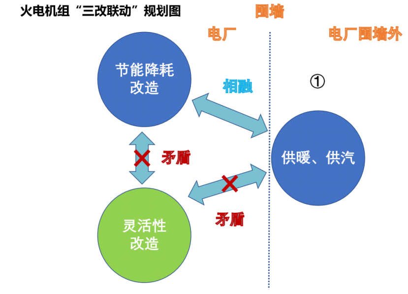一般说来,机组灵活性改造与节能降耗改造是相矛盾的,对所有按额定工况设计的机组、辅机在灵活性深度调峰工况下的运行都是不经济的,甚至影响设备安全性和设备寿命的,但是火电机组灵活性是政策所需、大势所趋,是必须要实现的,在很多情况下,节能改造技术在深度调峰工况下变成一句空谈。供热改造与灵活性改造也会发生矛盾,对一台向外进行工业供汽的机组而言,往往在30%负荷工况下难以满足供汽参数的要求。所以“三改联动”中的主要矛盾如上图所示,机组灵活性深度调峰工况下,节能与供热难以兼顾。