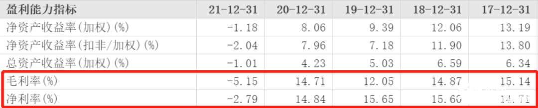 从盈利能力指标来看,2018年到2021年,公司的毛利率和净利润基本呈现波动下滑趋势,四年毛利率分别为14.87%,12.05%,14.71%和-5.15%,而净利润分别为15.60%,15.65%,14.84%和-2.79%。