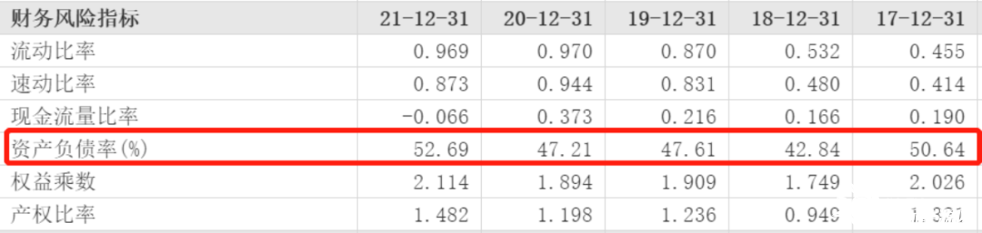 与之形成对应的是,公司的资产负债率也在这四年间不断上涨,从2018年的42.84%,上升到2021年的52.69%。