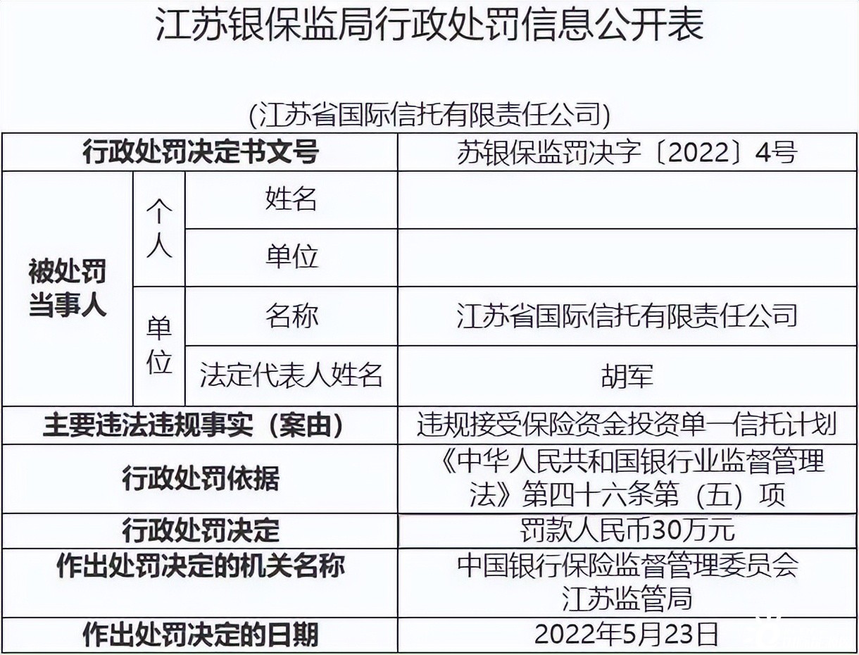 6月1日,江苏银保监官网披露,对江苏信托下发了两张罚单,一张是对江苏信托公司的罚单,一张是对该事件负责人的罚单。江苏信托主要违规原因显示为违规接受保险资金投资单一信托计划,对公司处罚30万元,对负责人实施警告,并处罚6万元。