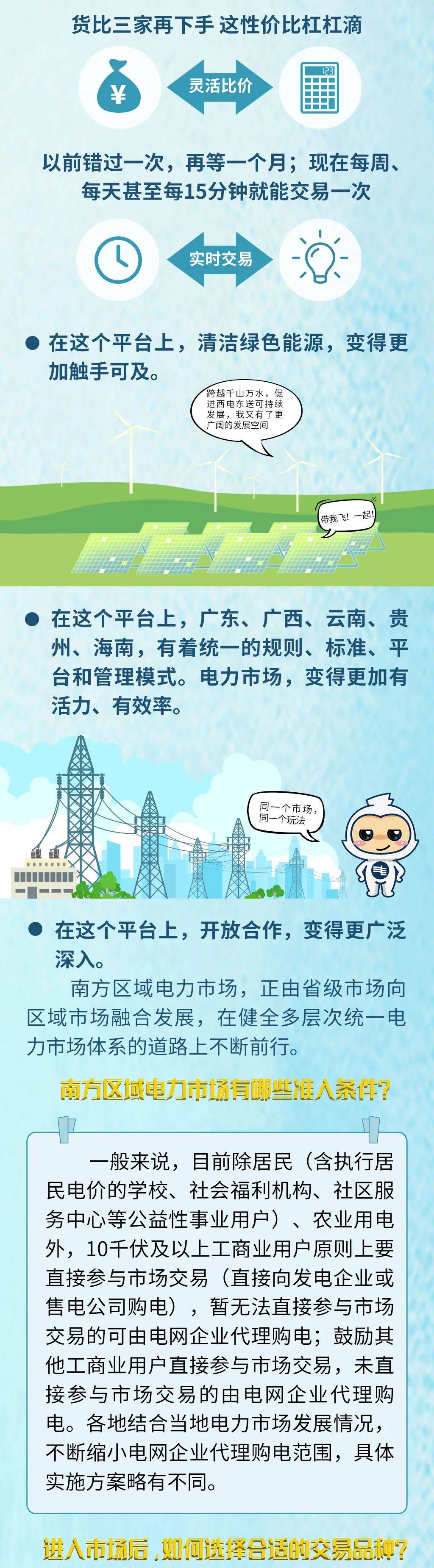 “届时,粤港澳大湾区与云南、贵州等西部地区,乃至东南亚国家之间的电力交易渠道将更加畅通。”广州电力交易中心发展研究部副主任梁志飞认为,西部电厂需要更广阔的销售渠道,而东部用户则希望有更灵活、更大范围的能源购买选择权,依托南方区域电力市场这一平台,各市场主体可以通过中长期、现货等多种方式参与电力交易,促进电力资源在更大范围内的优化配置,推动能源生产消费方式绿色低碳变革。