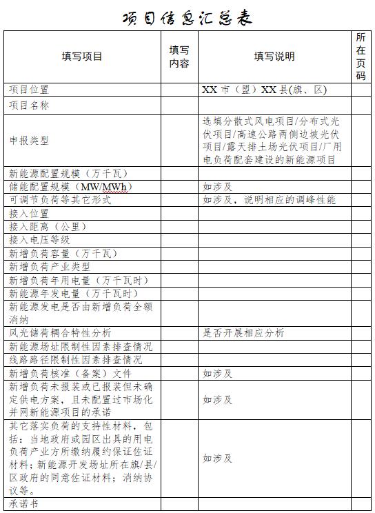 申报材料包括但不限于:项目申报汇总表、项目信息汇总表、项目实施方案文本、承诺函、燃煤机组调度协议、煤电与新能源联营初步方案、新能源场址及接入工程限制性因素排查文件、实施细则和编制大纲要求的其它相关材料等,一式五份。