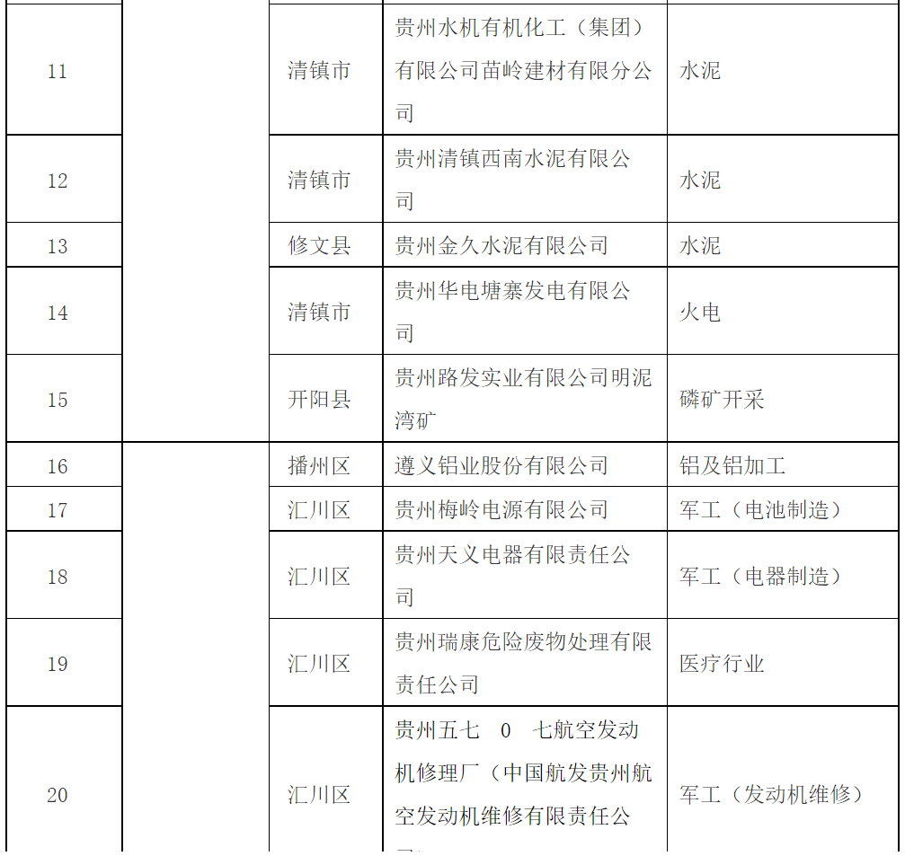 贵州省2018年强制性清洁生产审核企业名单