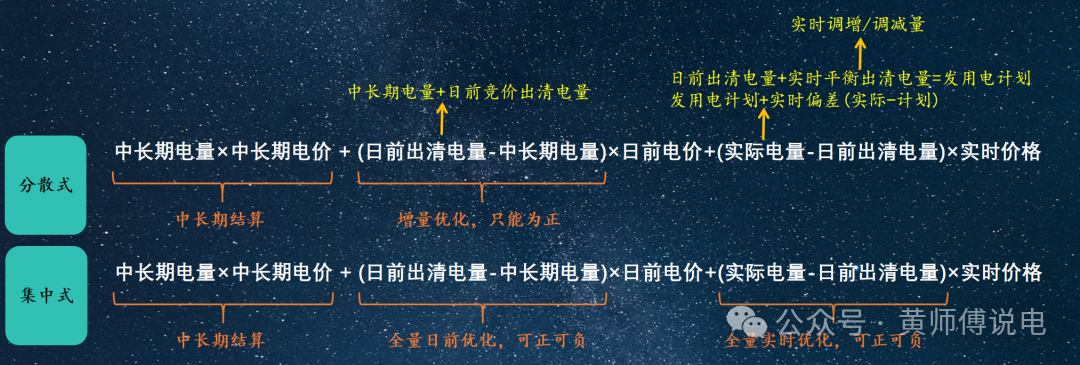 中长期合约电量×合约电价+(日前出清电量-中长期合约电量)×日前电价+(实际发行电量-日前出清电量)×实时电价