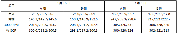 锅炉点火后,保持再热侧烟气挡板全开、过热烟气挡板全关,在机组并网前始终保持此方式不变,通过减小省煤器、低温过热器受热面吸热量,增加低温再热器受热面吸热量,逐步提高脱硝入口烟气温度。下表-3为2017年3月16日、7月5日#2机组冷态启动低温再热器、省煤器出口烟温对比分析。