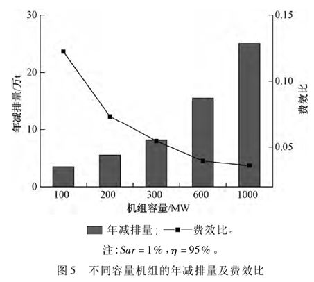 如图5所示,大容量机组的污染物年减排量较大,主要是因为发电标煤耗随着容量的增加而减少,使SOz排放量减少。脱硫设施的费用效益比值<1,且随着机组容量的增大而减小,说明大容量机组的经济效益更为显著,有利于实现环境和经济的双赢。