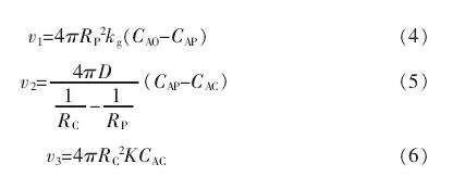 式中:v1为气体在气膜中的扩散速率,mol/s;v2为气体在产物层的扩散速率,mol/s;v3为气体的反应速率,mol/s;kg为气膜阻力系数,cm/s;K为化学反应速率常数,cm/s;CAO、CAP、CAC分别为反应气体在气体主相、颗粒表面以及颗粒反应界面处的浓度,mol/cm3;RP、RC分别为颗粒和未反应核的半径,cm。根据拟稳态假设则有: