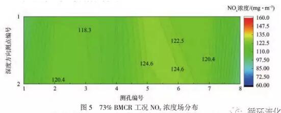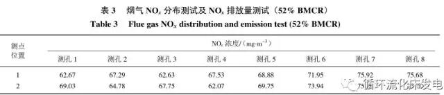 通过实验结果可以看出,在 52% BMCR、73% BMCR、88% BMCR 工况下烟气中 NOₓ 分布不均匀度分别达到 6.94%、8.02%、11.89%,离散值在 15% 以内,NOₓ 排放稳定,不高于 150 mg/m3,满足《火电厂大气污染物排放标准》(GB 13223-2011)规定的循环流化床排放限值。