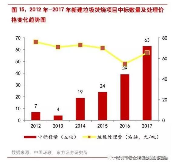 2) 垃圾焚烧处理费价格稳中有升:根据中国环联的数据统计,2012-2017 年,全国每年垃圾焚 烧项目招标的数量逐渐增多。但在这个期间出现了恶性竞争,甚至有过以 20-30 元/吨超低价 中标的极端情况,而行业普遍认为的垃圾焚烧处理合理的价格区间应为 60-80 元/吨。地方政 府在项目招标时采用最低价中标的方式,以及部分竞争力有限的公司希望以低价投标的策略迅 速抢占市场、扩张规模,造成了2012-2016 年垃圾焚烧处置费持续下降,2016 年全年中标均 价仅为 54.85 元/吨。2017 年,价格止跌回升,增长至 65.44 元/吨,项目的招标数量也增加 至 63 个(2015、2016 年分别为 24 和 39 个)。我们认为随着环保要求不断提升,部分资金 和运营实力有限的公司正在逐步退出垃圾焚烧运营市场,垃圾焚烧处理价格将维持在合理的水 平。上海环境、伟明环保等垃圾焚烧上市公司 2018 年新中标的项目垃圾处理费普遍在70-100 元/吨左右。