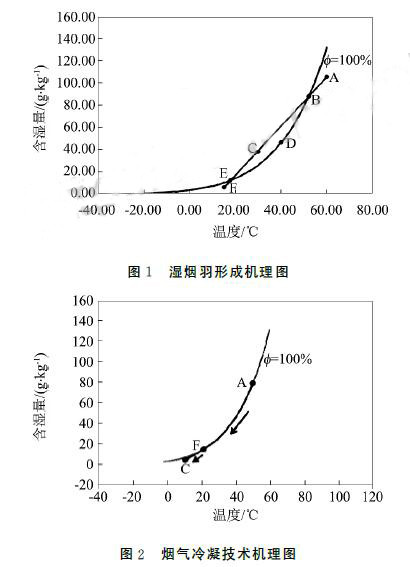 结合烟气加热和冷凝技术的特点,采用将烟气先冷凝再加热的方法,则可扩大系统湿烟羽消除对环境温湿度的适应范围。通过将原烟气冷却降温,降低了烟气中绝对含湿量,再经加热后,使烟气在向大气扩散和降温的过程中不达到饱和湿烟气的状态,不出现水汽的凝结,从而达到消除湿烟羽的效果。